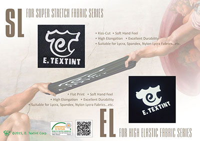 2016 主打概念 1 - 極致彈性 [ 高彈系列 ] 特色 印刷/ 模切系統 多種表面搭配效果選擇,如亮面、霧面、銀色/彩色高反光 適用於高彈布料,如: 緊身衣或壓縮衣 極佳拉伸及還原性 建議布種: 萊卡, Spandex, 尼龍萊卡等等 應用: 功能性戶外成衣、慢跑、自行車、泳裝、瑜珈等等 詳細產品資訊, 請點這裡. 更多資訊請與我司業務聯繫: This email address is being protected from spambots. You need JavaScript enabled to view it. Prev Next