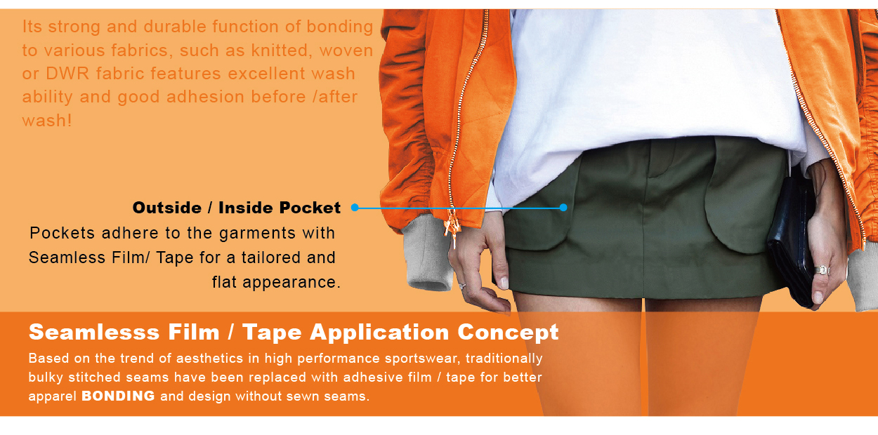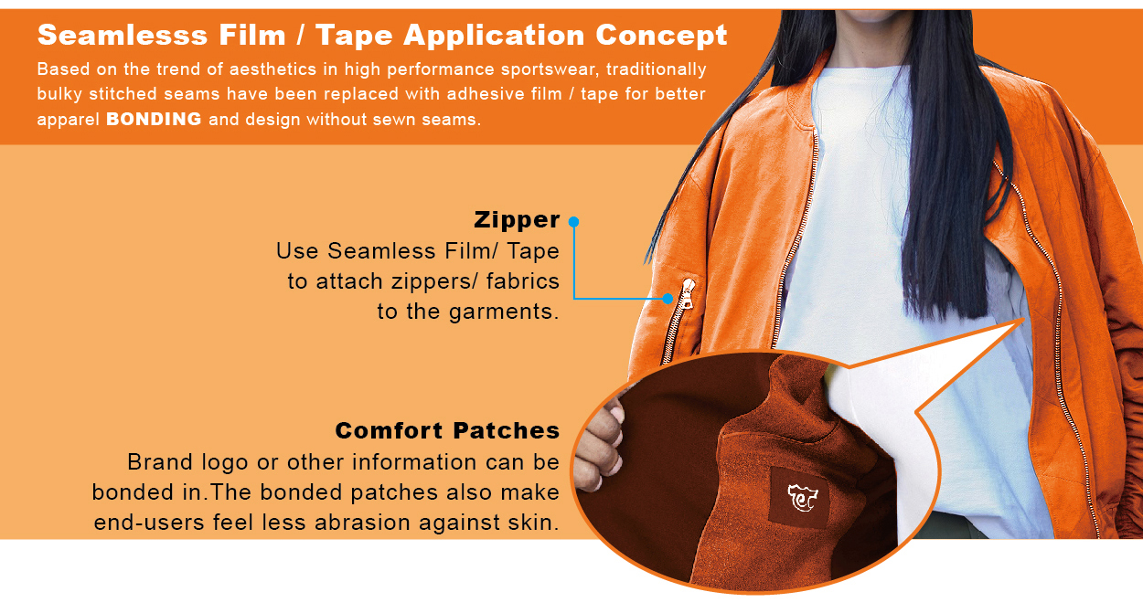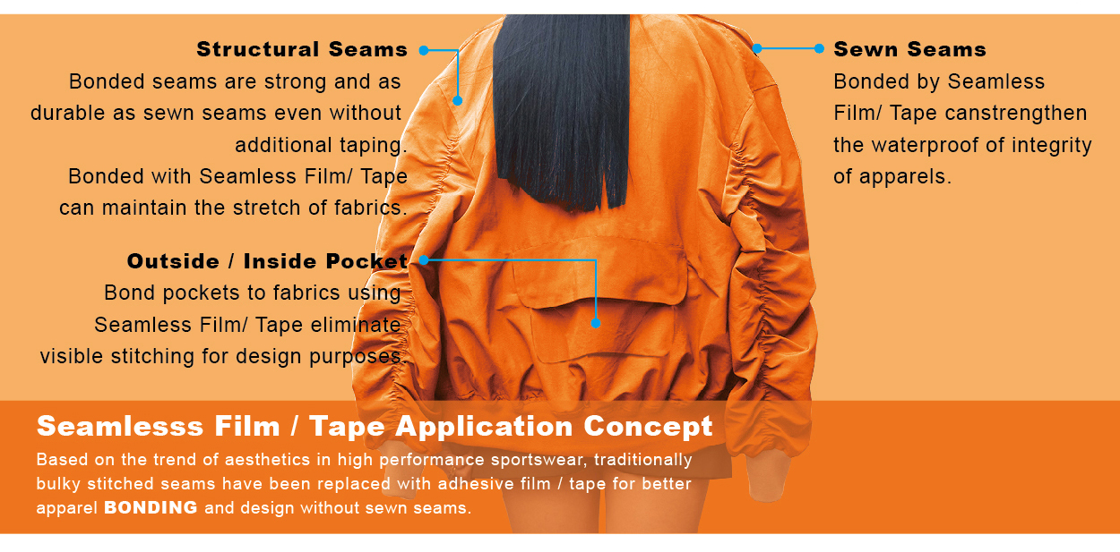 無縫膠條能取代傳統的車縫, 應用範圍廣,如:如:兩塊或多塊布料之間的結合處, 拉鍊、口袋的縫合處或接合處,不僅重量輕美觀還能加強其功能性,同時節省成本和提高生產效率。