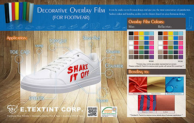 客戶能依照自行設計的圖案,將鞋材專用裝飾性膠膜切割成不同尺寸大小,切割容易且應用範圍廣,根據您的鞋子設計需求, 提供多種表面效果和顏色做搭配,能讓產品增添時尚或趣味元素!
